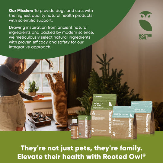 There is no known negative interaction between our Rooted Owl™ Mobility & Calm Treats and normal pet diets, supplements, Chinese herbs, Western herbs or other holistic treatments.